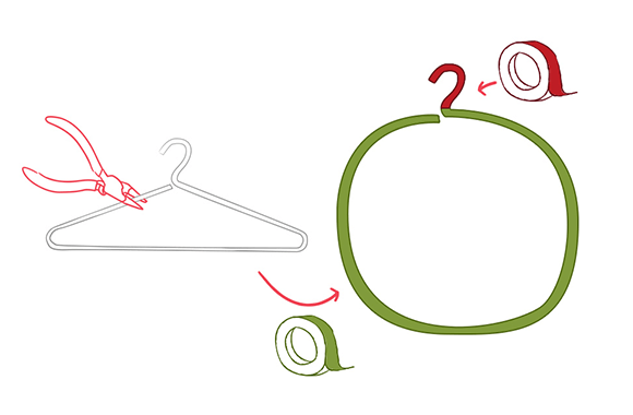 A l'aide de la pince, je vais déformer le cintre pour en faire un cercle. Inutile de chercher la perfection : le buis viendra cacher la structure. Je garde par contre le crochet en place, qui servira à suspendre ma couronne à la porte. Je recouvre ensuite l'ensemble du cintre avec du masking tape vert et le crochet avec du masking tape rouge.