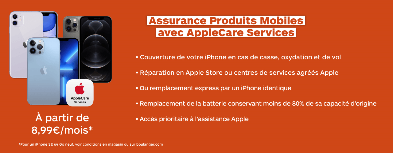 Avec l’assurance produits mobiles AppleCare Services, choisissez la couverture qui vous convient le mieux afin de protéger votre iPhone* en cas de casse, d’oxydation et de vol. Cette assurance vous permet de bénéficier des prestations et de l’assistance Apple.