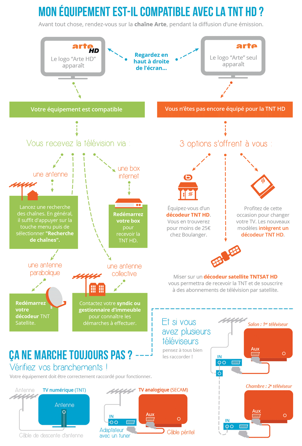 Votre téléviseur ne semble pas compatible avec la TNT HD. Pas de panique : pour continuer à recevoir la TV à partir du 5 avril, il suffit simplement de connecter un décodeur TNT HD à votre téléviseur : rapide et efficace !