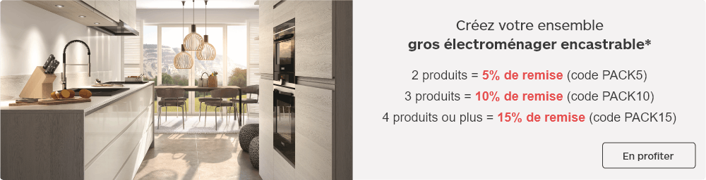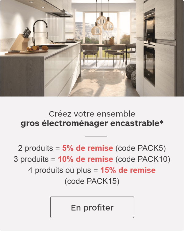 *Offre valable sur tous les produits encastrables, hors marque Listo : four / table / lave vaisselle / micro-ondes / réfrigérateur / congélateur / cave à vin / machine à café / tiroir. Hors promotions en cours, exclusivités internet, marketplace, produits reconditionnés, lots déjà existants et rayon cuisines équipées, pour un minimum de 499€ d’achat.