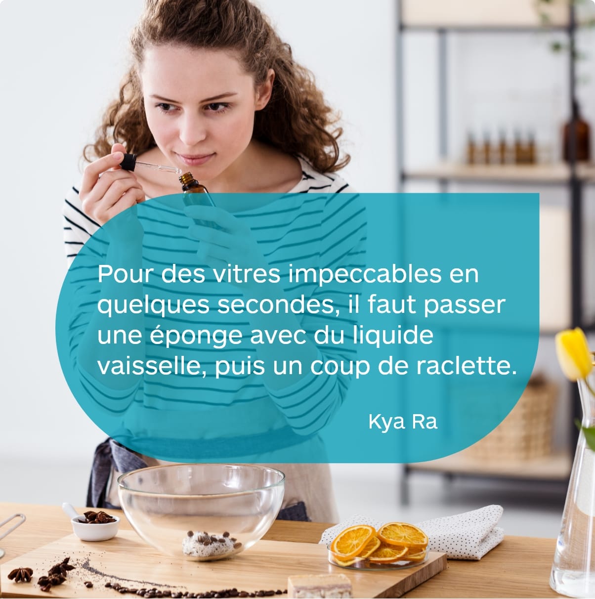Pour les nettoyeurs de vitres, on utilise également des huiles essentielles pour se passer de détergent. C’est écologique, efficace et ça sent très bon !