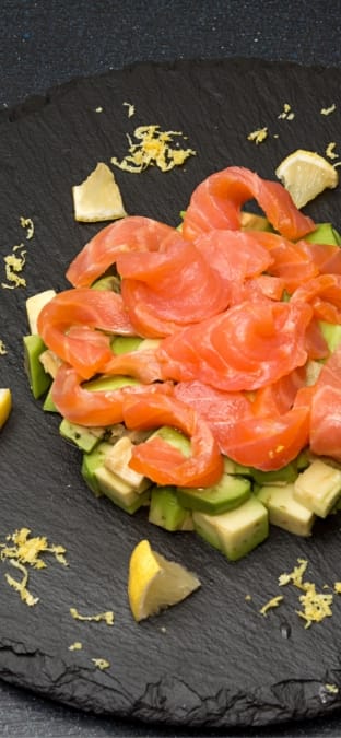 5. Dans l’assiette, alternez saumon, avocat et pamplemousse puis versez la sauce à l’aneth par dessus.