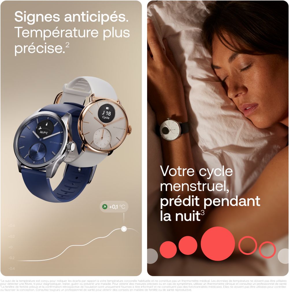 La montre WITHINGS ScanWatch 2 propose également un suivi du cycle menstruel directement sur la montre, très facile à utiliser.