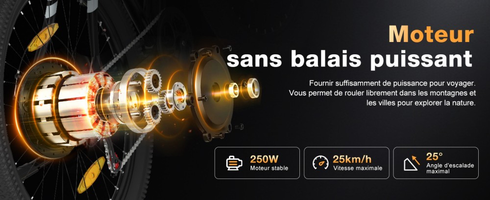 Le moteur sans balais de 250 W peut atteindre une vitesse de 25 km/h, le moteur sans balais a une durée de vie plus longue et démarre plus rapidement. Les pneus antidérapants peuvent vous aider à rouler facilement sur le gravier, la pluie et la boue, vous permettant de faire face facilement à divers terrains et de vous offrir une expérience de conduite douce et sûre.