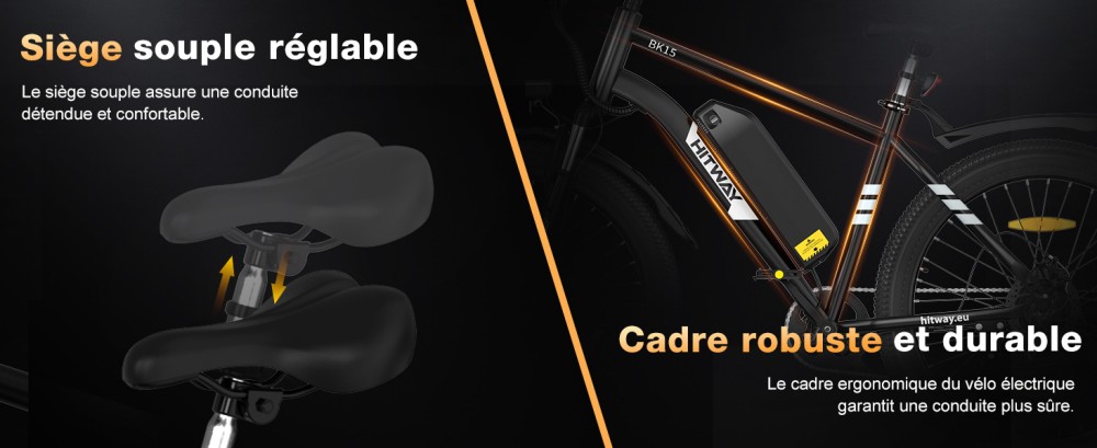 L'amortisseur avant peut absorber les chocs et les vibrations, et les freins à disque avant et arrière sont conçus pour un freinage fiable, vous offrant une protection de conduite complète. La selle réglable vous permet de rouler plus confortablement.