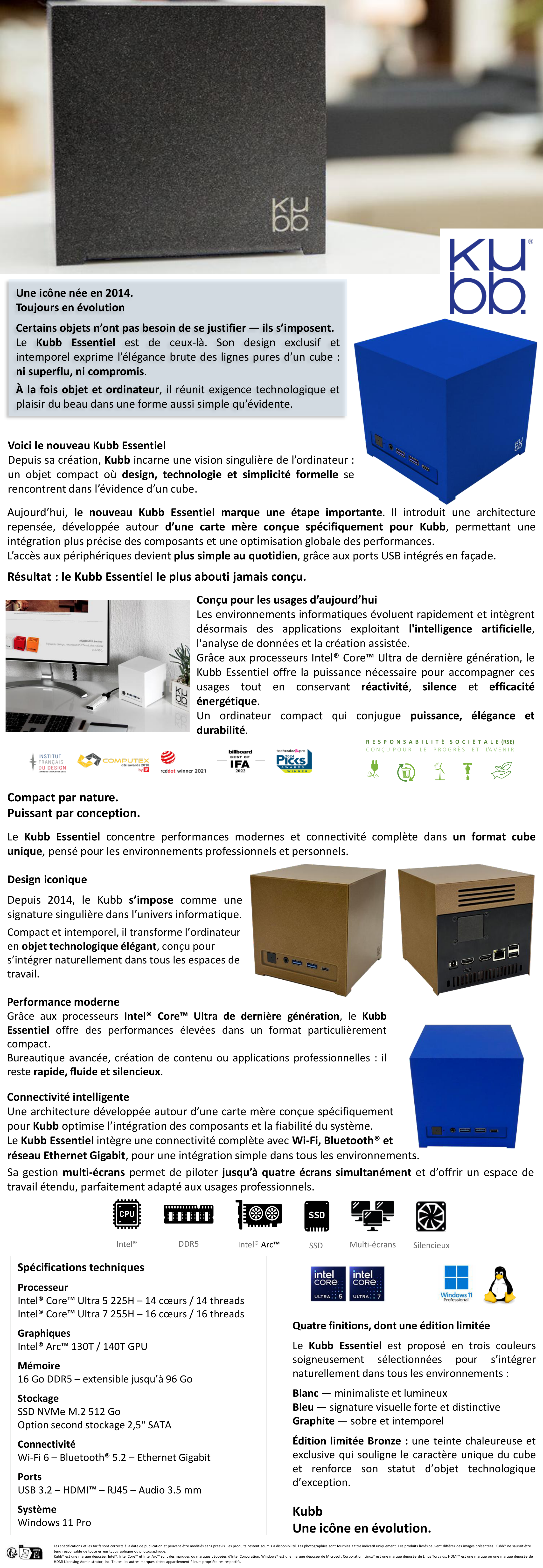 Aujourd’hui, le nouveau Kubb Essentiel évolue avec une architecture repensée autour d’une carte mère conçue spécifiquement pour Kubb, pour une intégration optimisée des composants et des performances améliorées au quotidien. L’accès aux périphériques est simplifié grâce aux ports USB intégrés en façade.